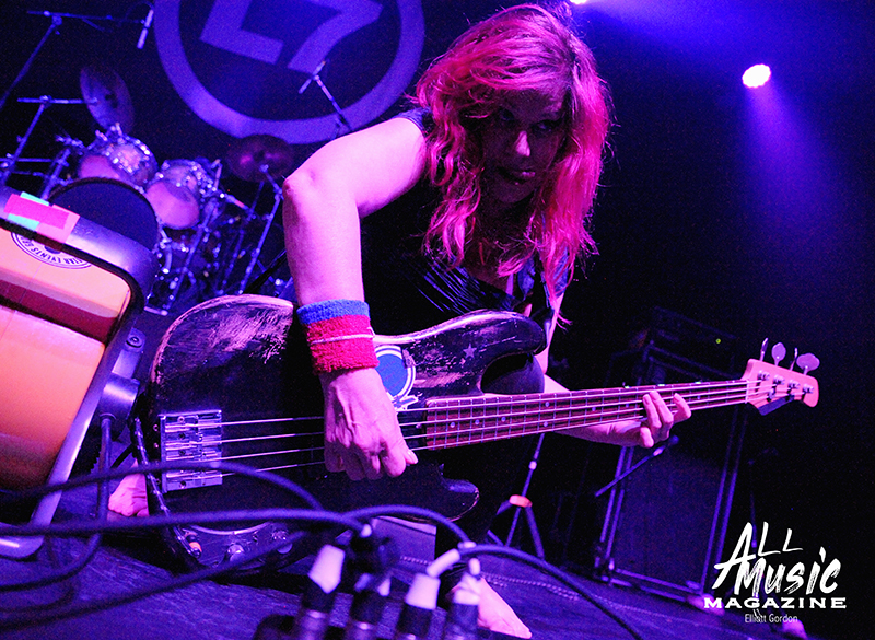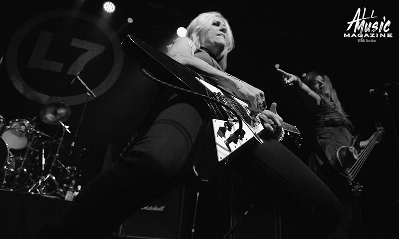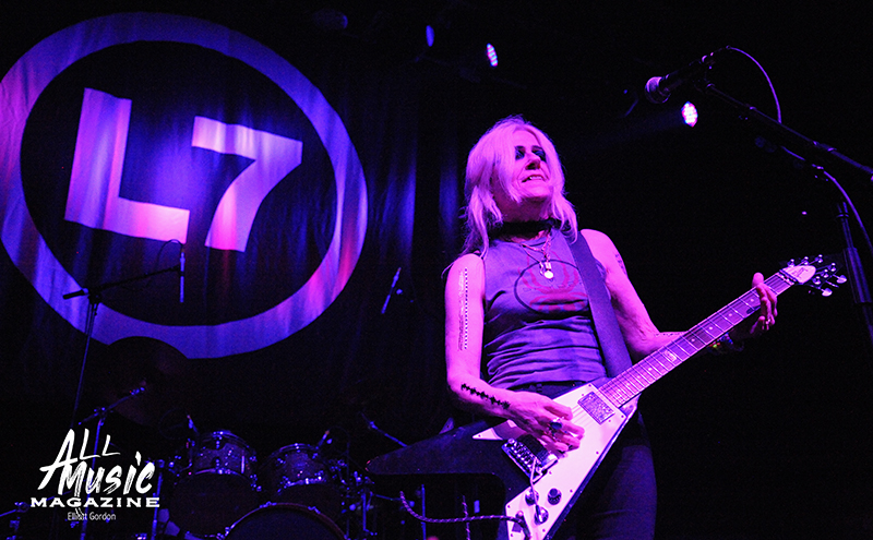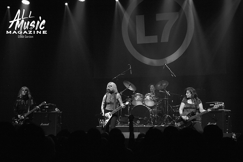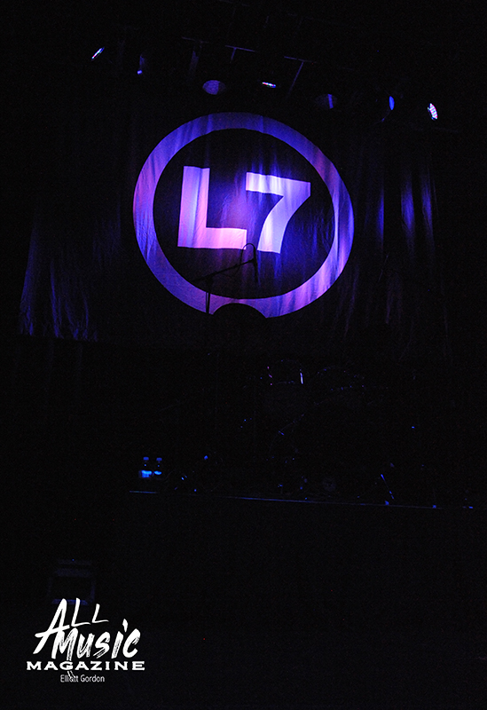 With cumgirl8’s equipment cleared out and the clock slowly closing in on the 9:30pm hour, the L7 logoed backdrop lit up while long-time bandmates Donita Sparks (lead vocals/guitar), Suzi Gardner (guitar/vocals), Jennifer Finch (bass), and Demetra “Dee” Plakas (drums) entered the stage to screaming audience adulation. L7 then broke open their evening with “Deathwish,” a track off their second studio album, Smell the Magic (1990).