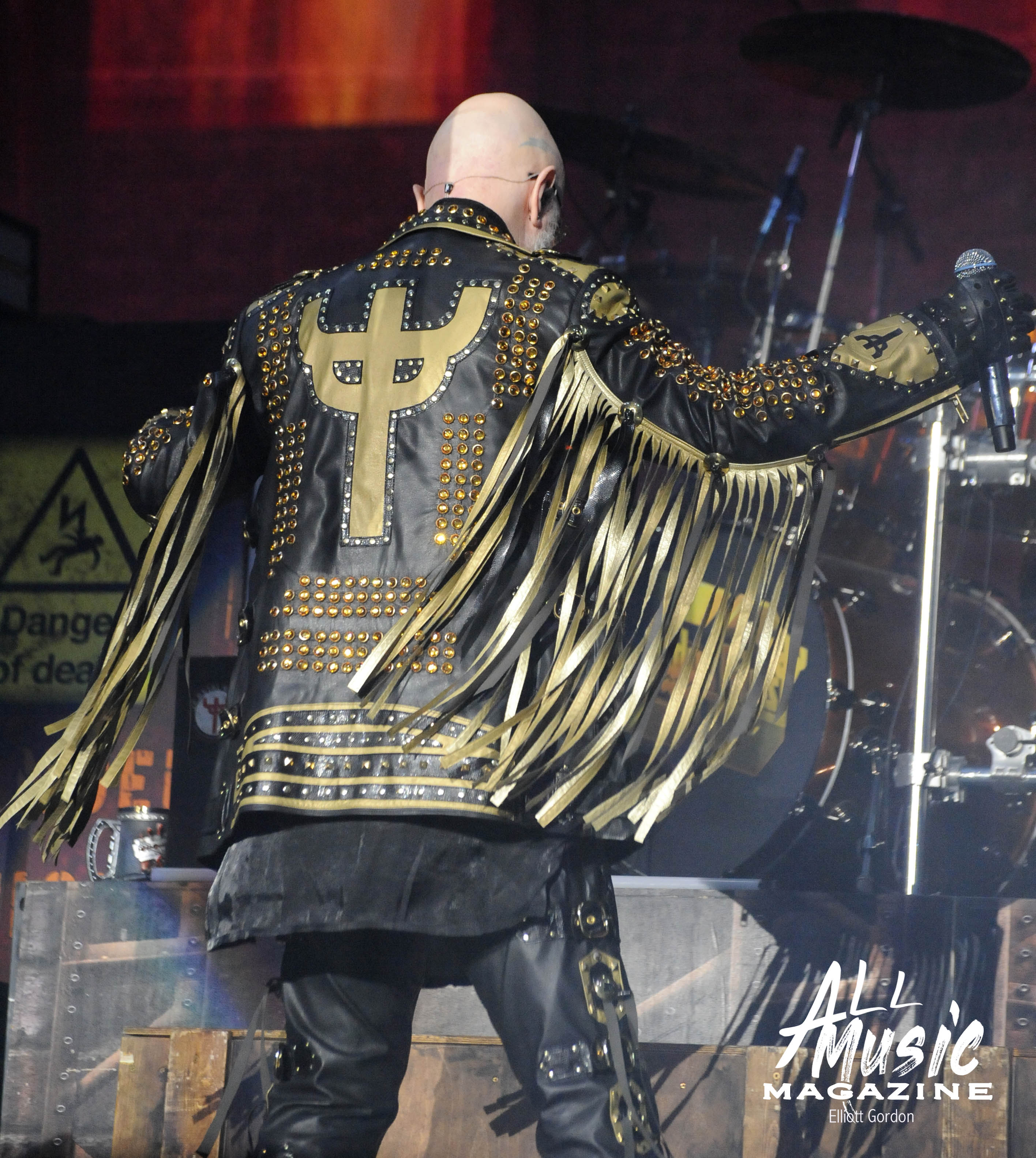 The tarp was removed from Priest’s ceiling-suspended pitchfork/cross symbol as the nine o’clock hour approached, followed shortly thereafter by the lights going dark in the amphitheatre to the sound of “War Pigs.” The evening temperature had already crept down into the crisp low 50s, but the night was about to heat up as Judas Priest took the stage with the familiar silhouette of singer Rob “Metal God” Halford standing with his back to the crowd in front of the drum riser.