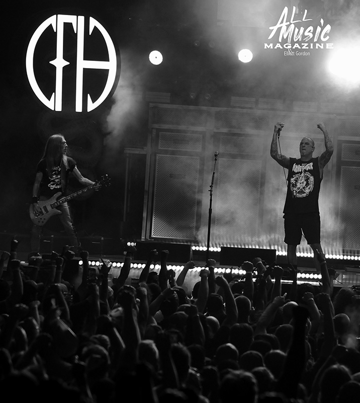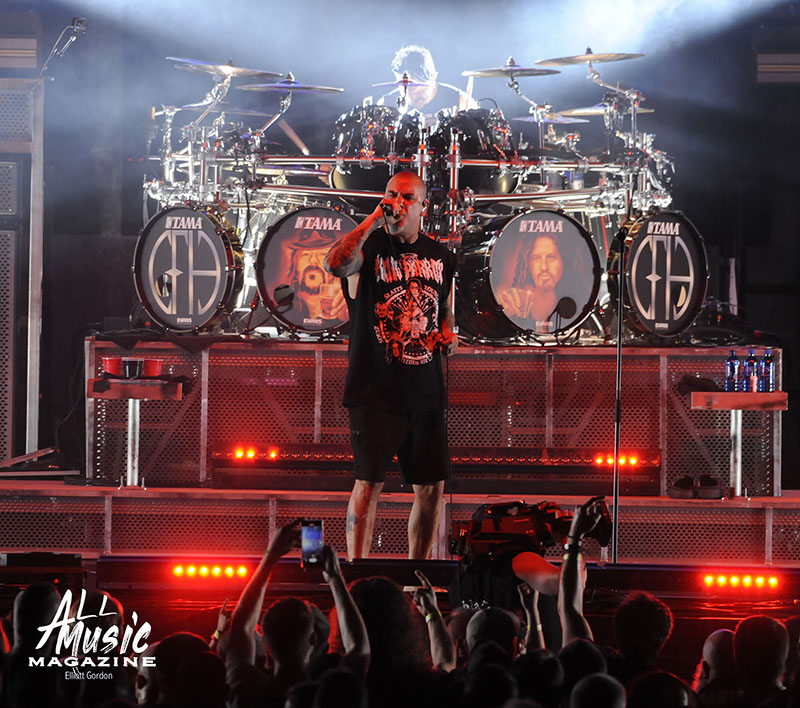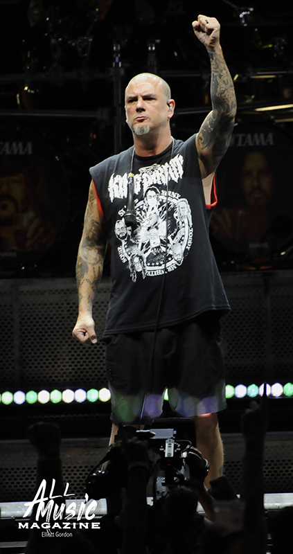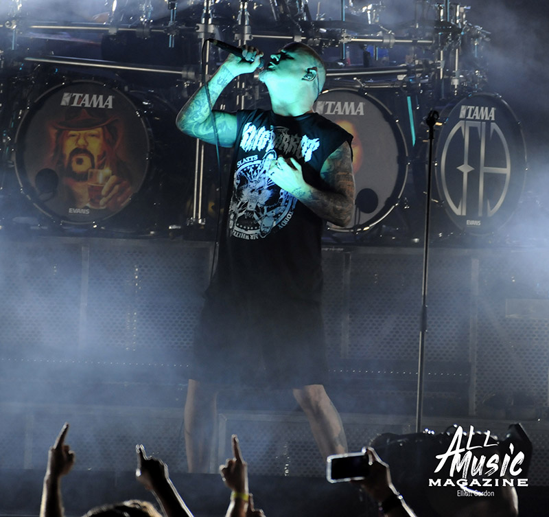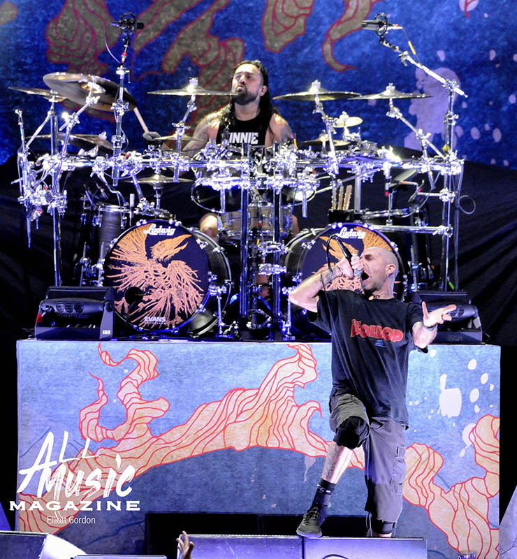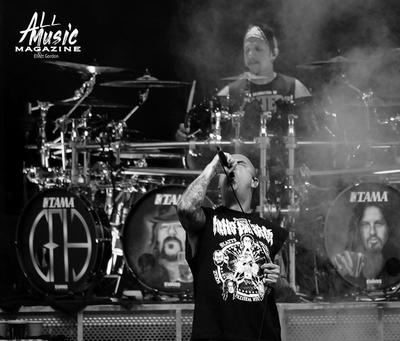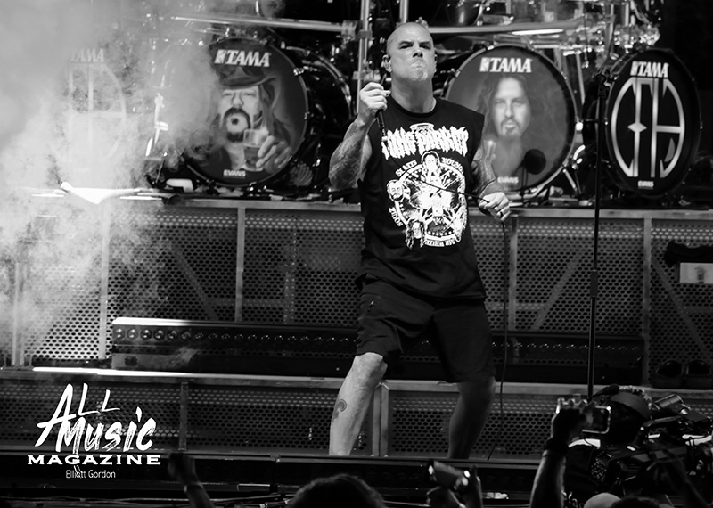 At precisely 9:15pm, the stage curtain lit up with the Pantera logo, which immediately drew cellphones out of pockets across the sold-out amphitheatre. With an explosion of noise marking the start of their set, the curtain dropped and revealed Pantera as they launched into “A New Level” from the band’s 1992 release, Vulgar Display of Power. As most fans are aware, Pantera’s new touring lineup features legacy members Anselmo (vocals) and Rex Brown (bass), along with highly respected musicians Charlie Benante (Anthrax) and Zakk Wylde (Ozzy Osbourne, Black Label Society) performing in place of the late, great Abbott brothers, “Dimebag” Darrell Abbott (guitar) and Vincent “Vinnie Paul” Abbott (drums).