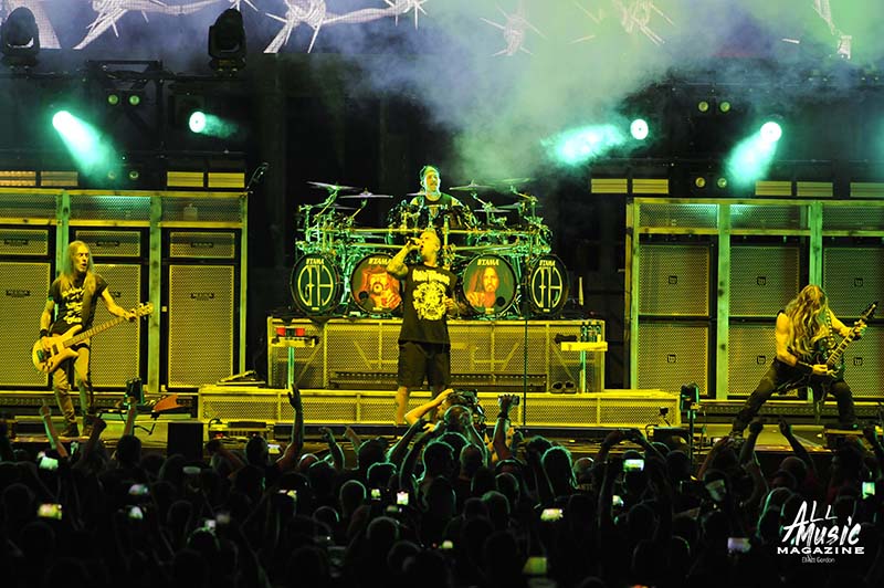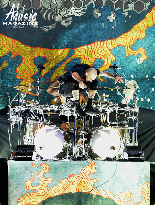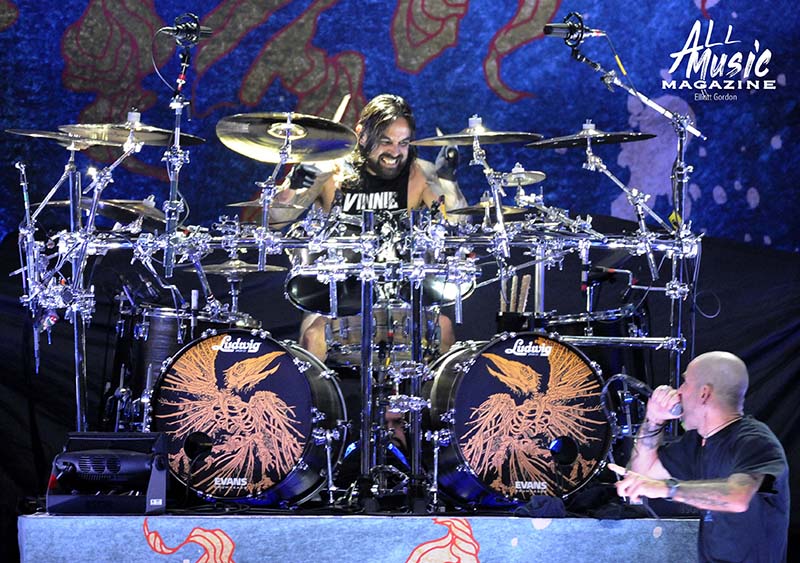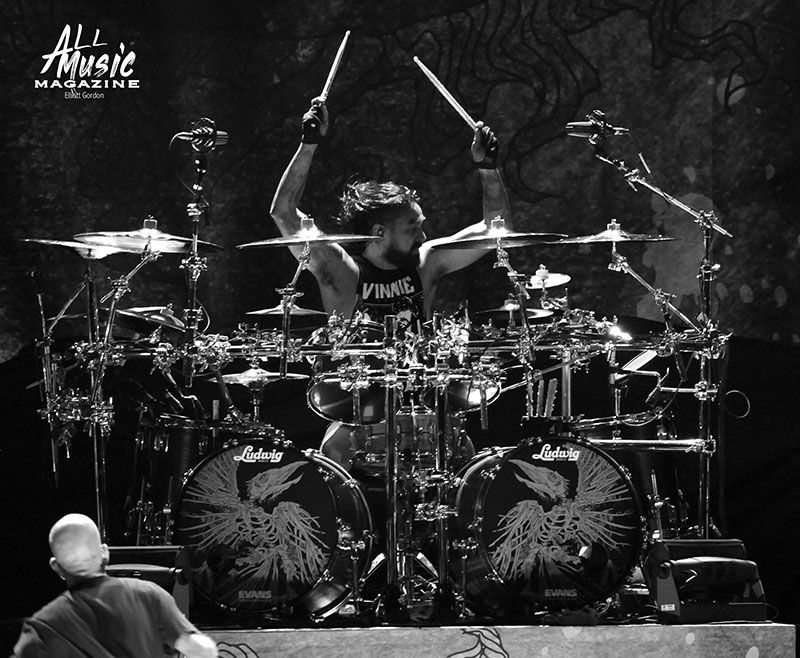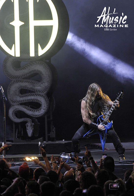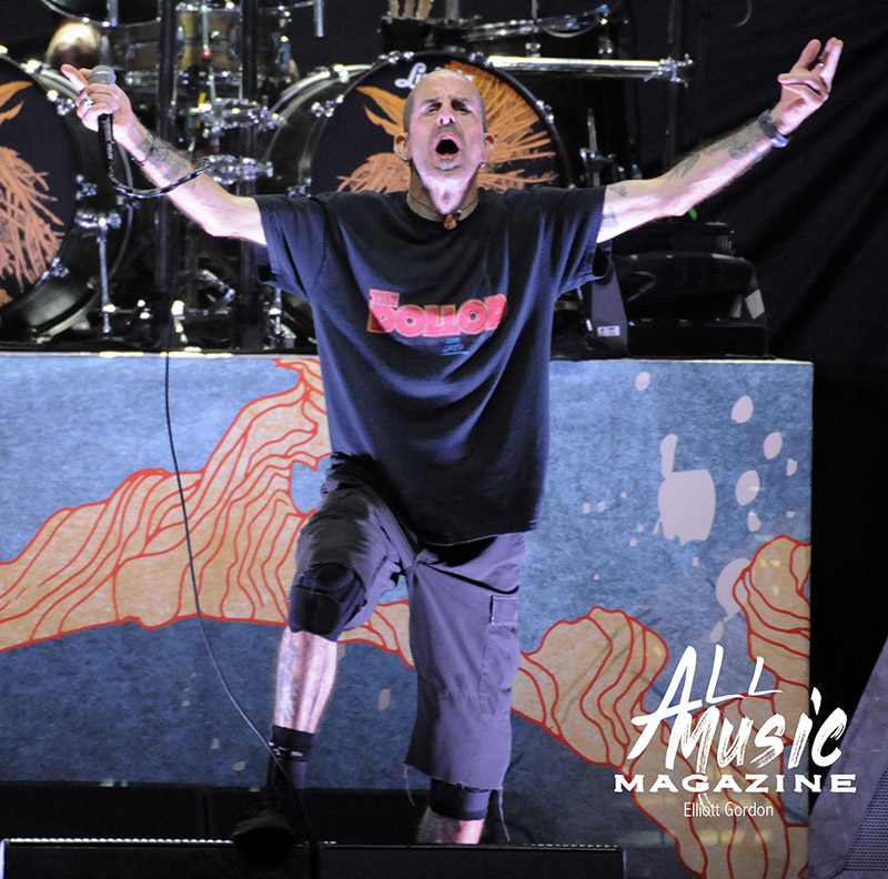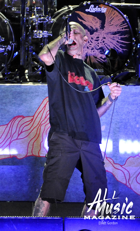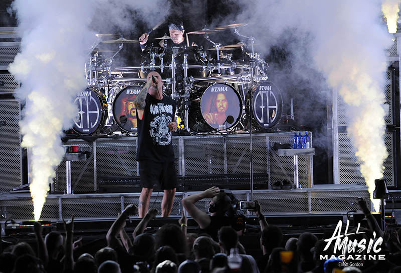 At precisely 9:15pm, the stage curtain lit up with the Pantera logo, which immediately drew cellphones out of pockets across the sold-out amphitheatre. With an explosion of noise marking the start of their set, the curtain dropped and revealed Pantera as they launched into “A New Level” from the band’s 1992 release, Vulgar Display of Power. As most fans are aware, Pantera’s new touring lineup features legacy members Anselmo (vocals) and Rex Brown (bass), along with highly respected musicians Charlie Benante (Anthrax) and Zakk Wylde (Ozzy Osbourne, Black Label Society) performing in place of the late, great Abbott brothers, “Dimebag” Darrell Abbott (guitar) and Vincent “Vinnie Paul” Abbott (drums).
