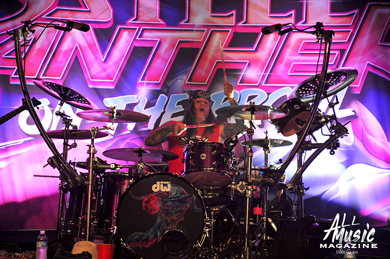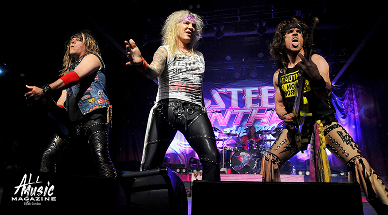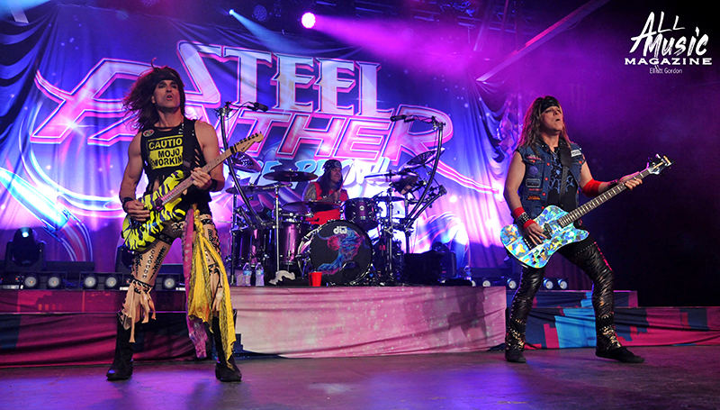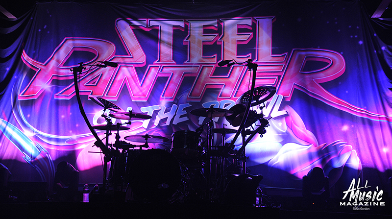 With the equipment turned over and the large Steel Panther “On the Prowl” backdrop lit up, drummer Stix Zadinia appeared from behind the curtain and took his kit seat in front of a packed house of adoring fans at approximately 9:00pm. Quickly joined by Michael Starr (vocals), Satchel (guitar) and Spyder (bass), the band immediately launched into “Eyes of the Panther” from their debut studio album, Feel the Steel (2009). This was followed by another banger in “Tomorrow Night,” a track off their 2011 release Balls Out, before the band took a pause to get into their comedic shtick with the audience.