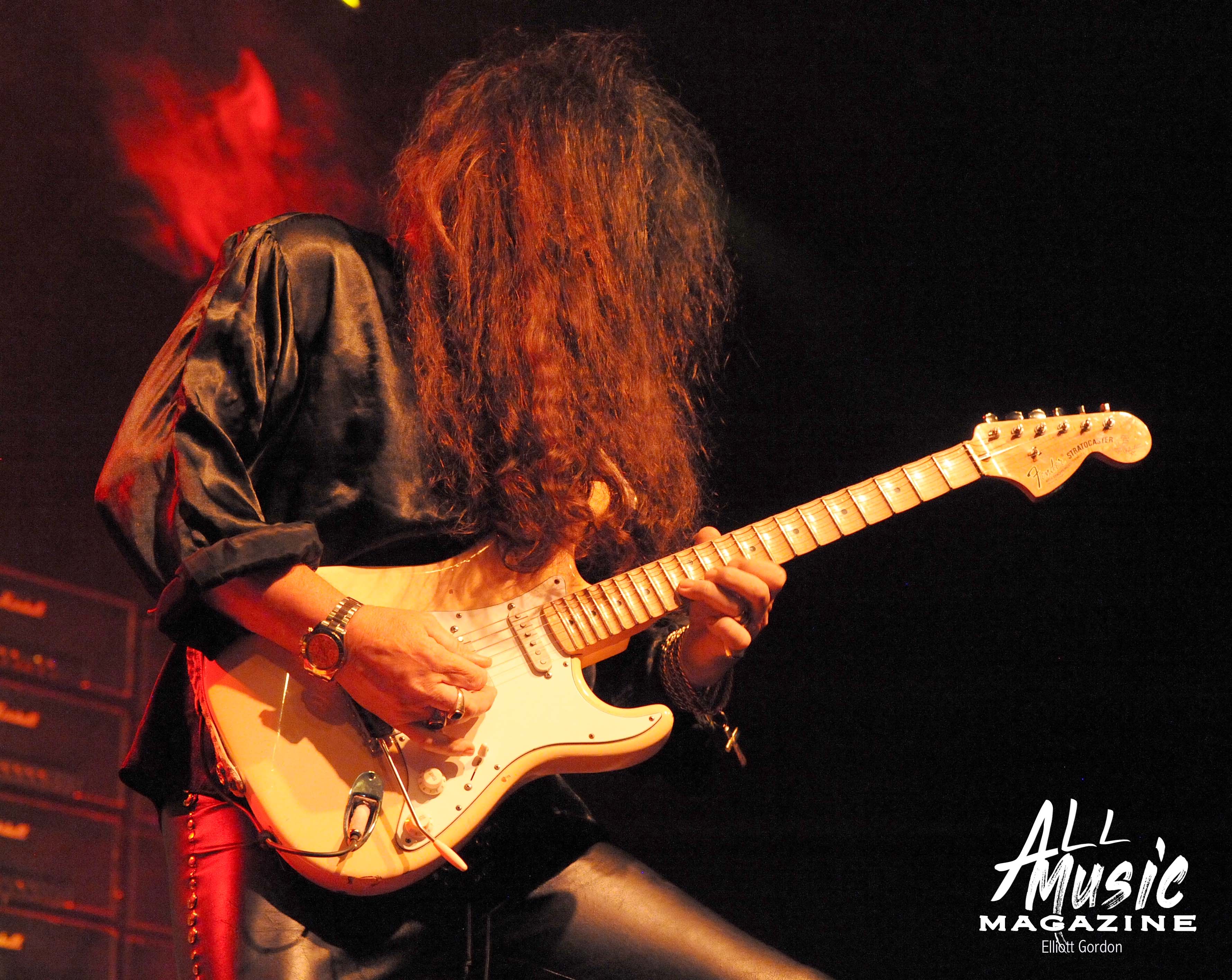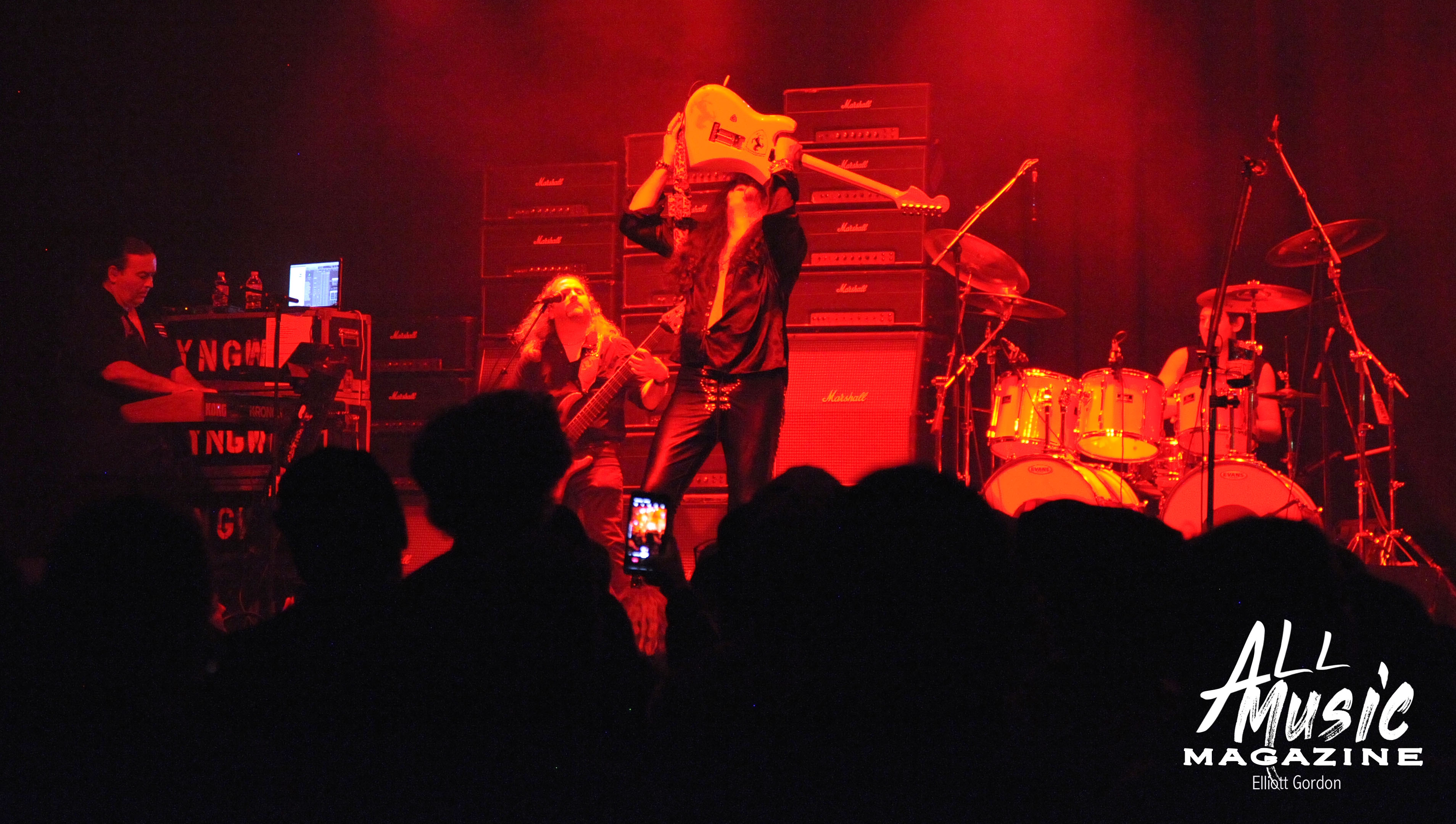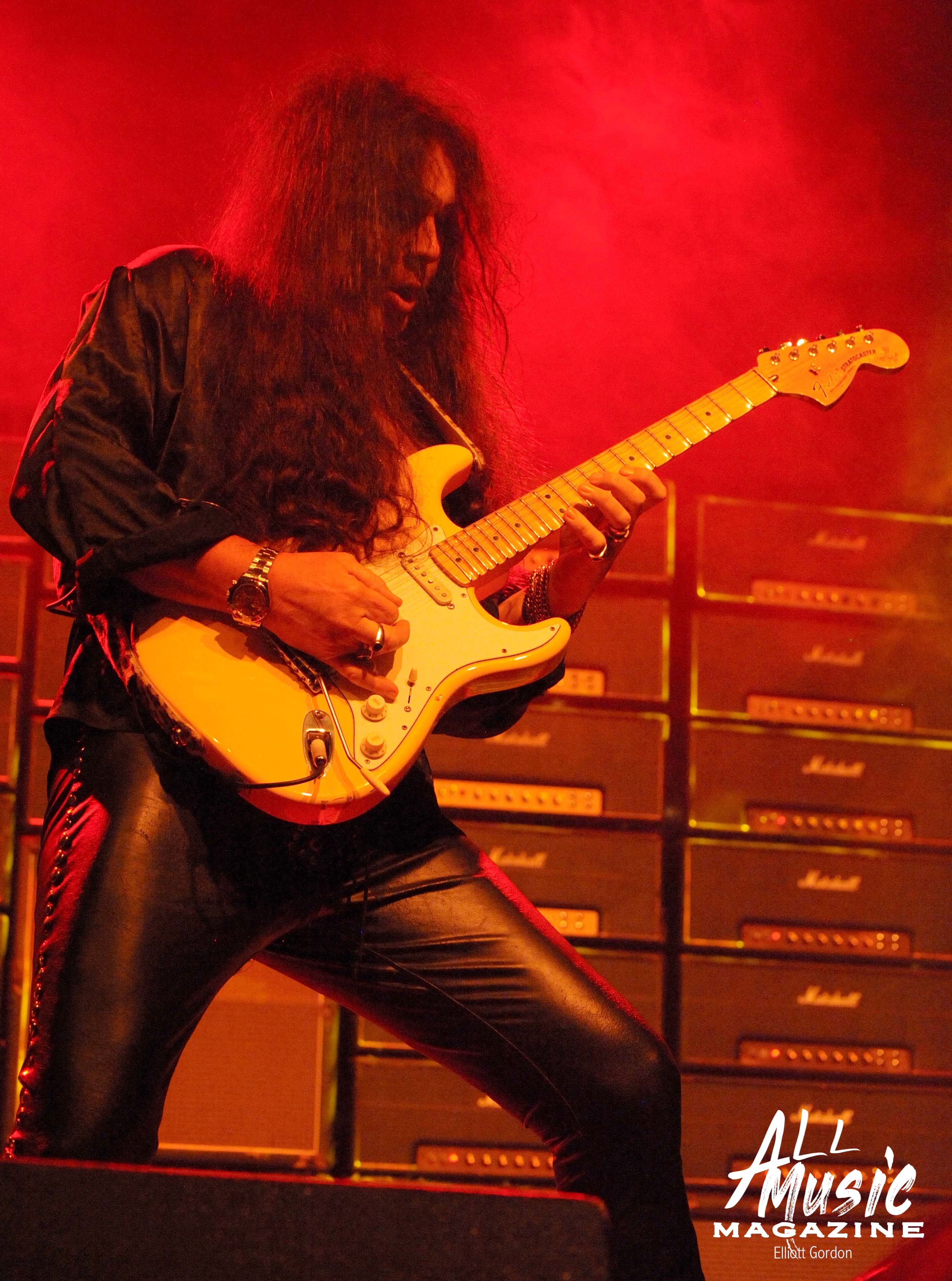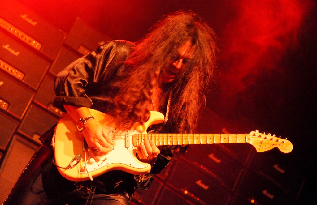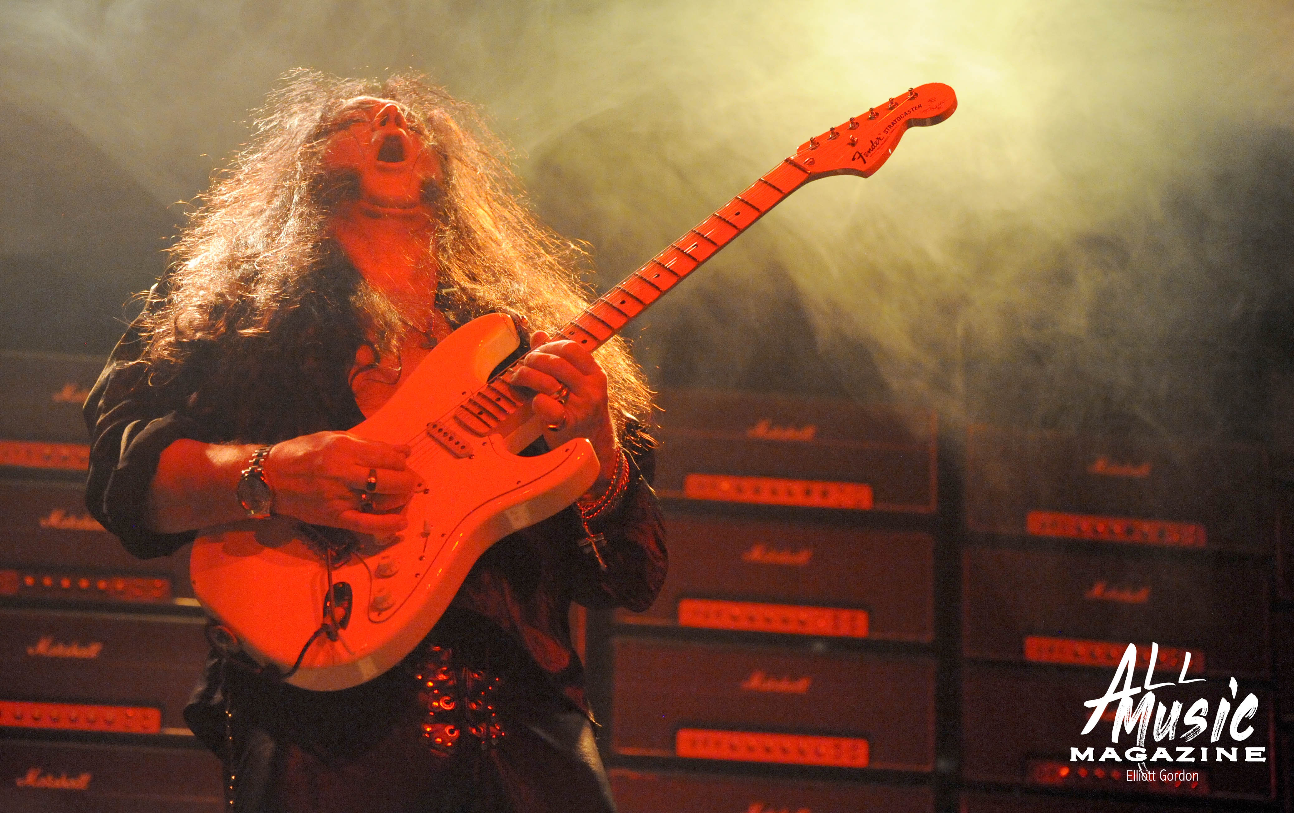 At approximately 10:15pm, the familiar sound of 58-year-old Malmsteen tapping away on his Fender Stratocaster from behind the stage reverberated through the wall of 80ish Marshall amps, signaling the start of his set. With a burst of smoke and the illumination of red and yellow stage lights, Malmsteen marched out and launched into one of his signature songs, “Rising Force.”