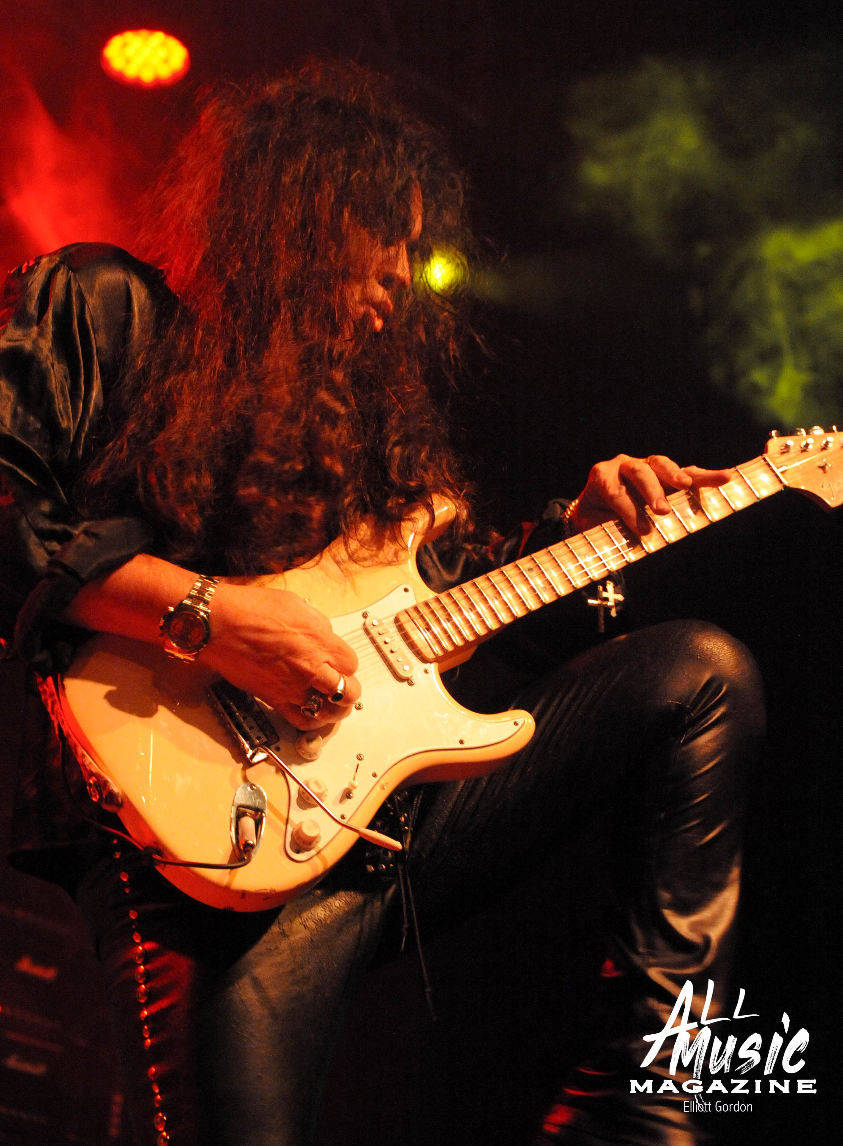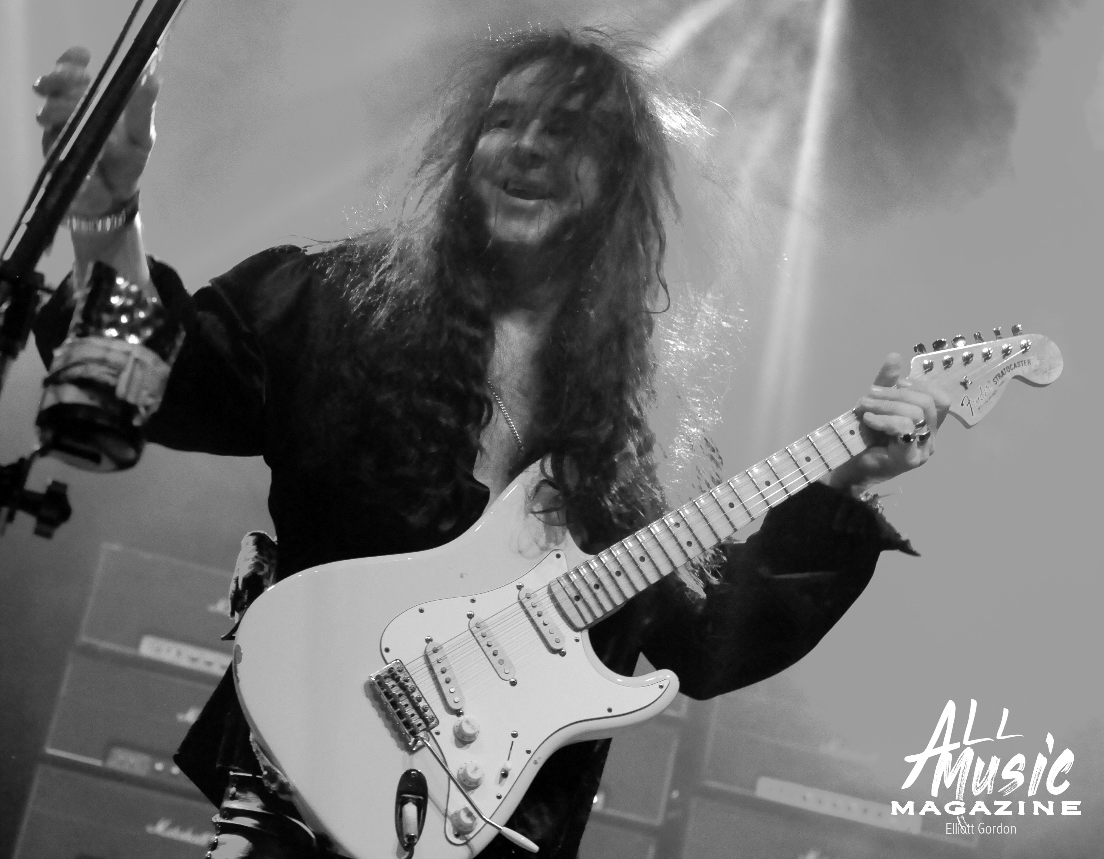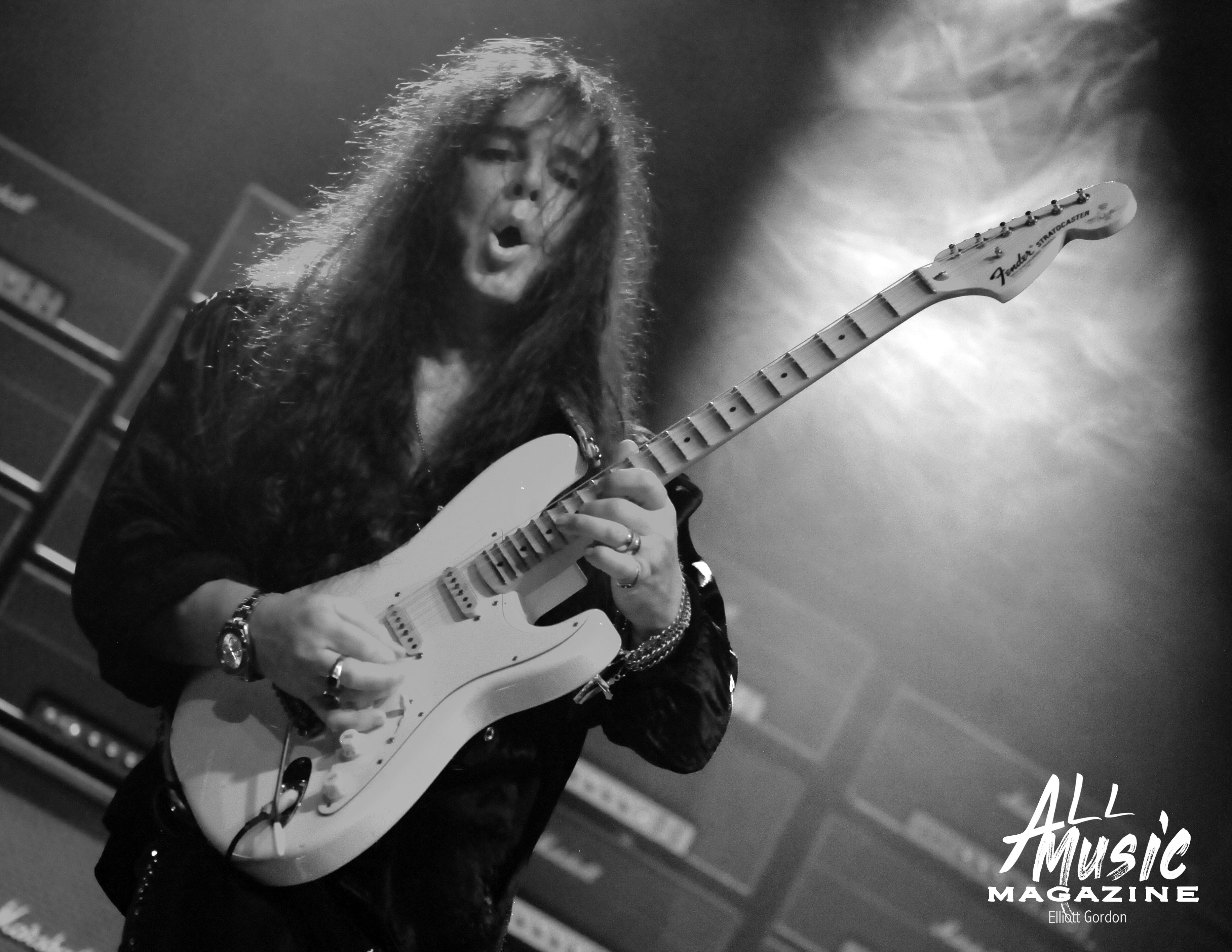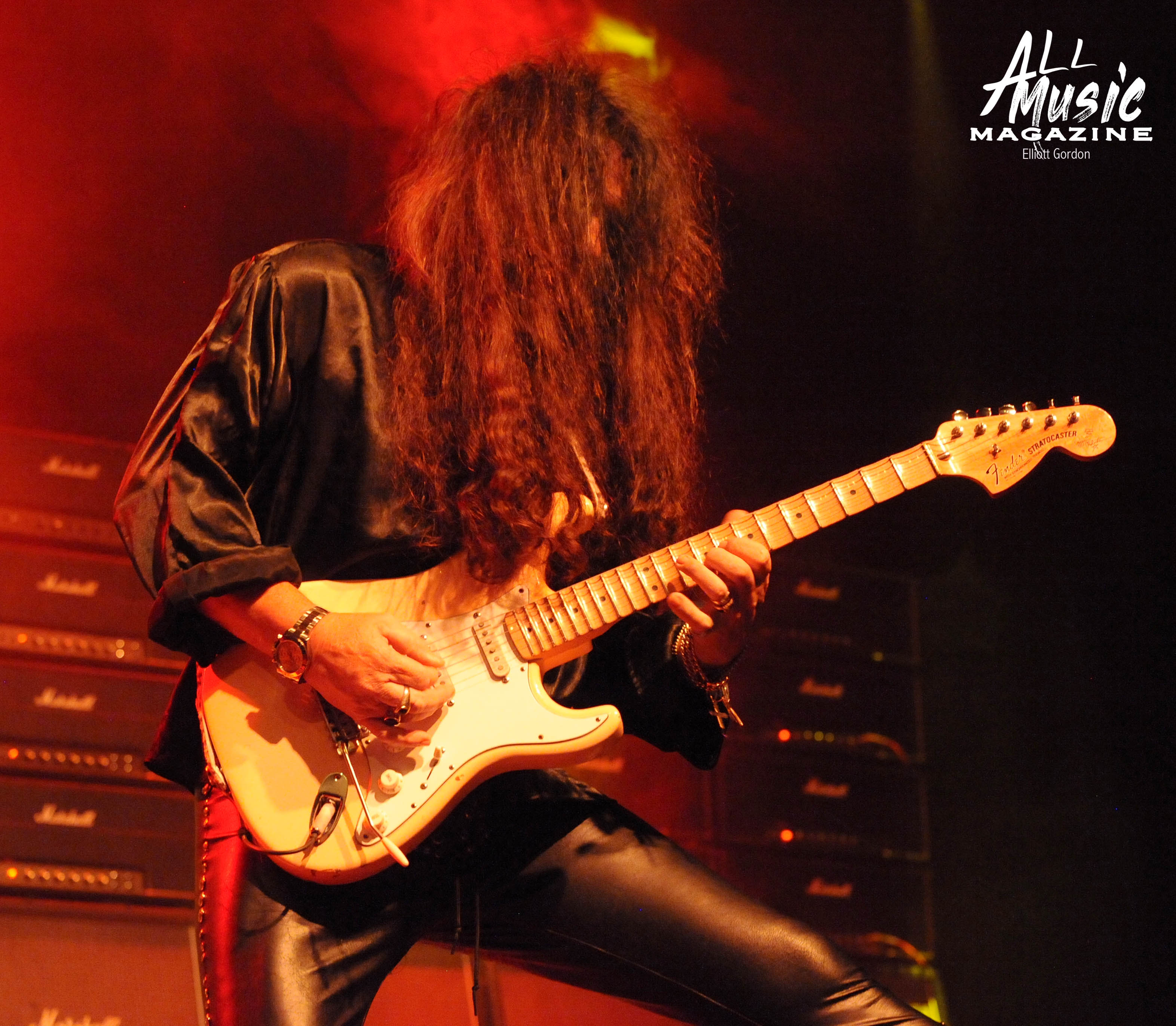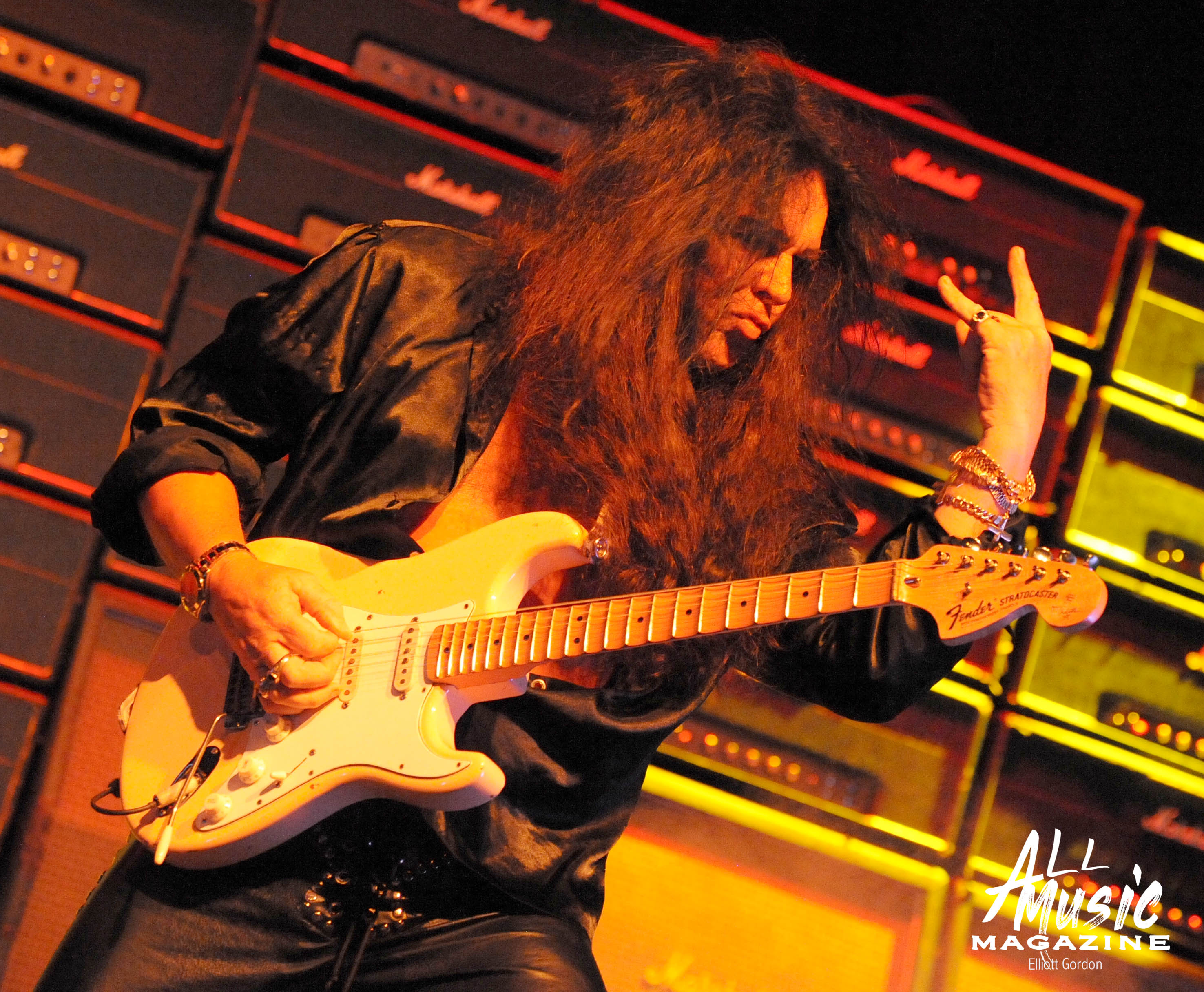 At approximately 10:15pm, the familiar sound of 58-year-old Malmsteen tapping away on his Fender Stratocaster from behind the stage reverberated through the wall of 80ish Marshall amps, signaling the start of his set. With a burst of smoke and the illumination of red and yellow stage lights, Malmsteen marched out and launched into one of his signature songs, “Rising Force.”
